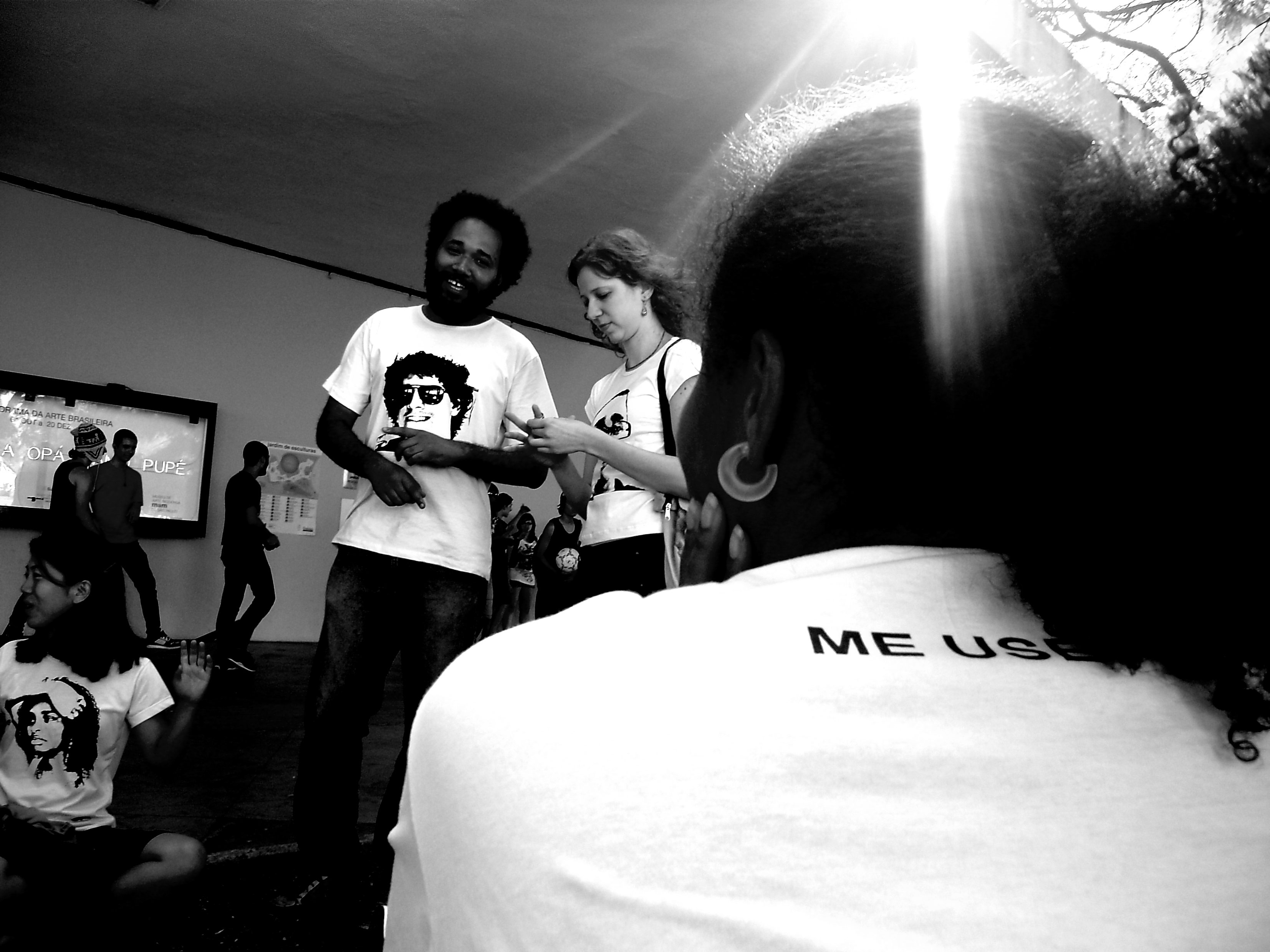 A performance “Me Use” contou com a participação de certo número de convidados que vestiam camisas estampadas de maneira artesanal com o rosto reconhecível de outro dos “performers” participantes. Para cada performer participante havia a equivalência de uma camiseta com sua foto/imagem na mesma proporção, gerando uma troca de imagens entre os participantes. “Você me usa, eu uso fulano, fulano te usa”. A ação performática consistiu na permanência dos performers em um mesmo local público[2], em atitude não coreografada, vivendo e fazendo coisas cotidianas, tais como o espectador desavisado, se misturando à massa ao mesmo tempo em que objetiva chamar atenção pela quantidade de pessoas-produto circulando no local.