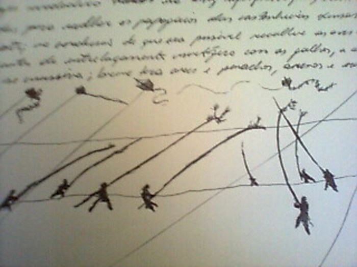 O olhar capta, ao longe, os pequenos traços, diagonais que se movimentam tortuosamente; dizemos delas; vez e outra se direcionando febrilmente para um mesmo ponto. Na aproximação percebe-se o detalhe dos voadores; quadriláteros, pentágonos e hexágonos coloridos pululando o céu de poucas nuvens; seguros por fios afiados. As pipas travam uma batalha indireta no firmamento enquanto no limite da areia seca os pés descalços desenham no solo uma vontade difícil de entender; e os corpos multiformes carregam os bacamartes piques de cá para lá e de lá para cá (piques de 5, 10 metros); numa dança desengonça de conjuntos que se batem; desconjuntados; as varas com vestígios de folhagem nas pontas, ou por vezes verdadeiros troncos de talvez significativo peso, eram, de início, utilizados para recolher os papagaios das castanheiras densas que invadem o concreto; na conclusão de que seria possível recolher as aves de papel-de-seda antes do entrelaçamento mortífero com os galhos, a atitude tornou-se massiva; breve terá cores e penachos, arenas e ordem…(?)… quem sabe, um espetáculo de representação de verdadeiras falanges gregas…