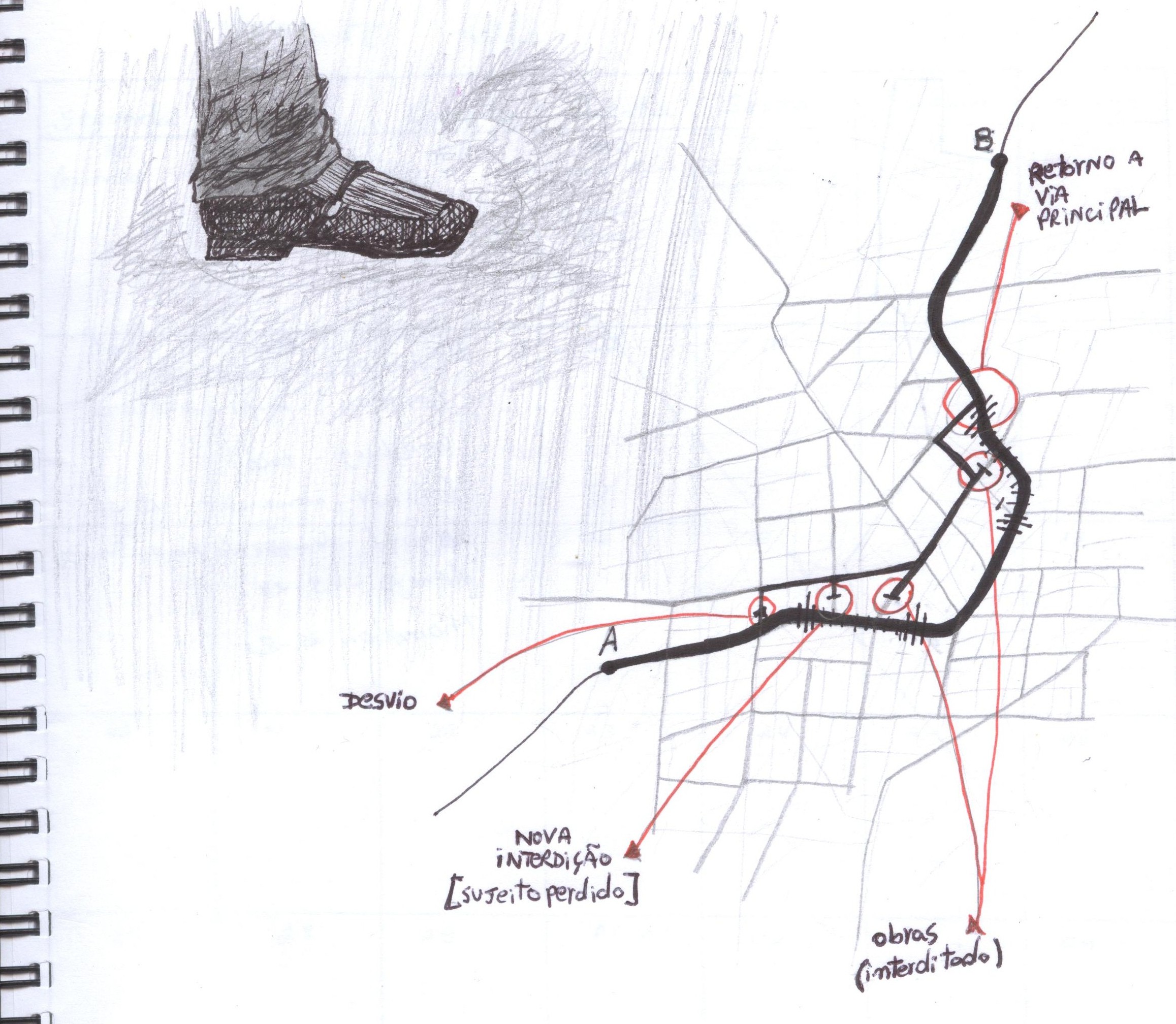 Segunda tentativa: obras – retorno. O se perder é um eficiente modo de travar novos contatos com o espaço. O sentido de desorientação torna o sujeito vulnerável e aberto para habitar a cidade. Porém… somente lhe apeteceu o objetivo de chegar ao ponto B. No visual, proliferaram novas informações que foram apreendidas objetivamente como um novo caminho, mas, ainda, um desvio pela via.