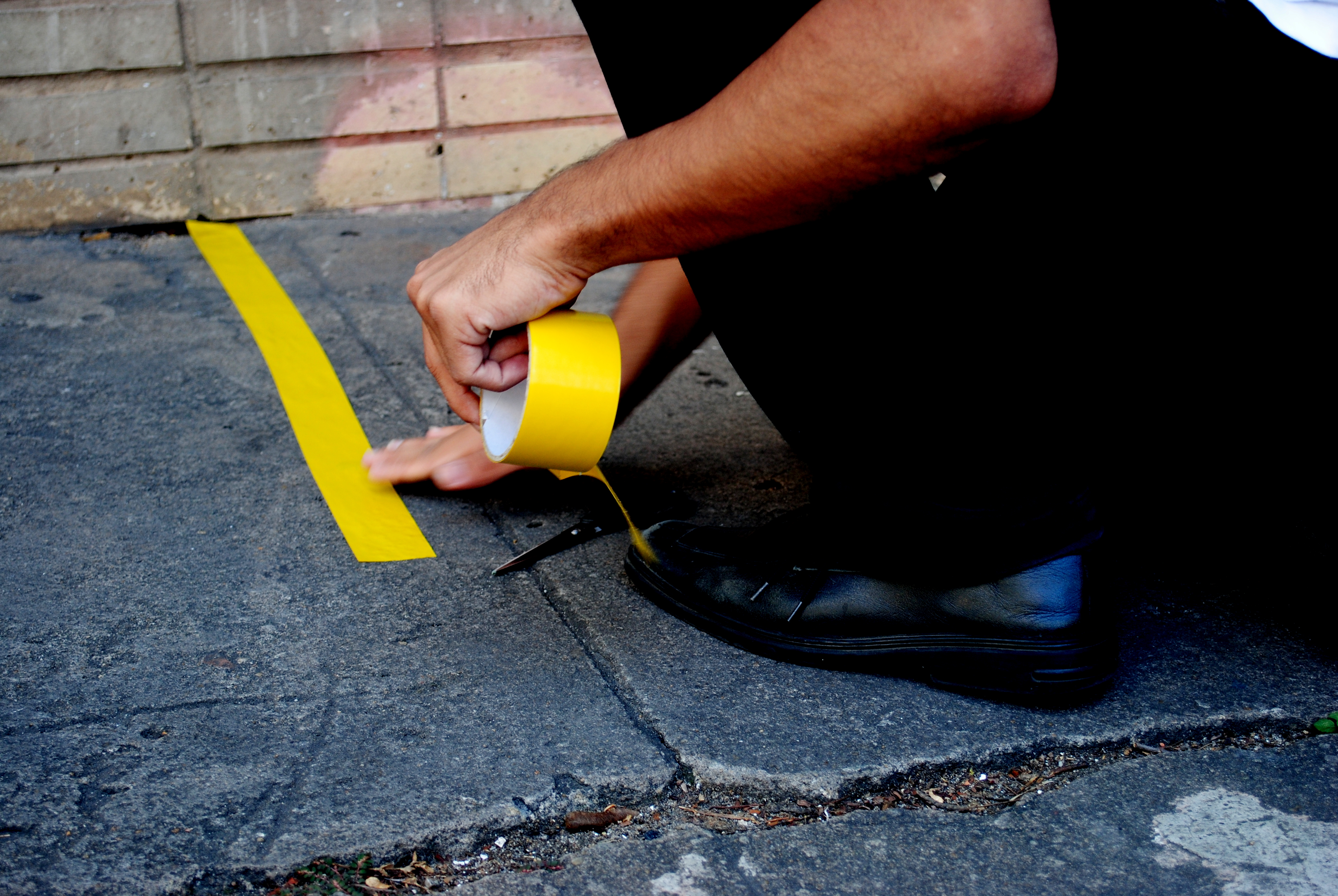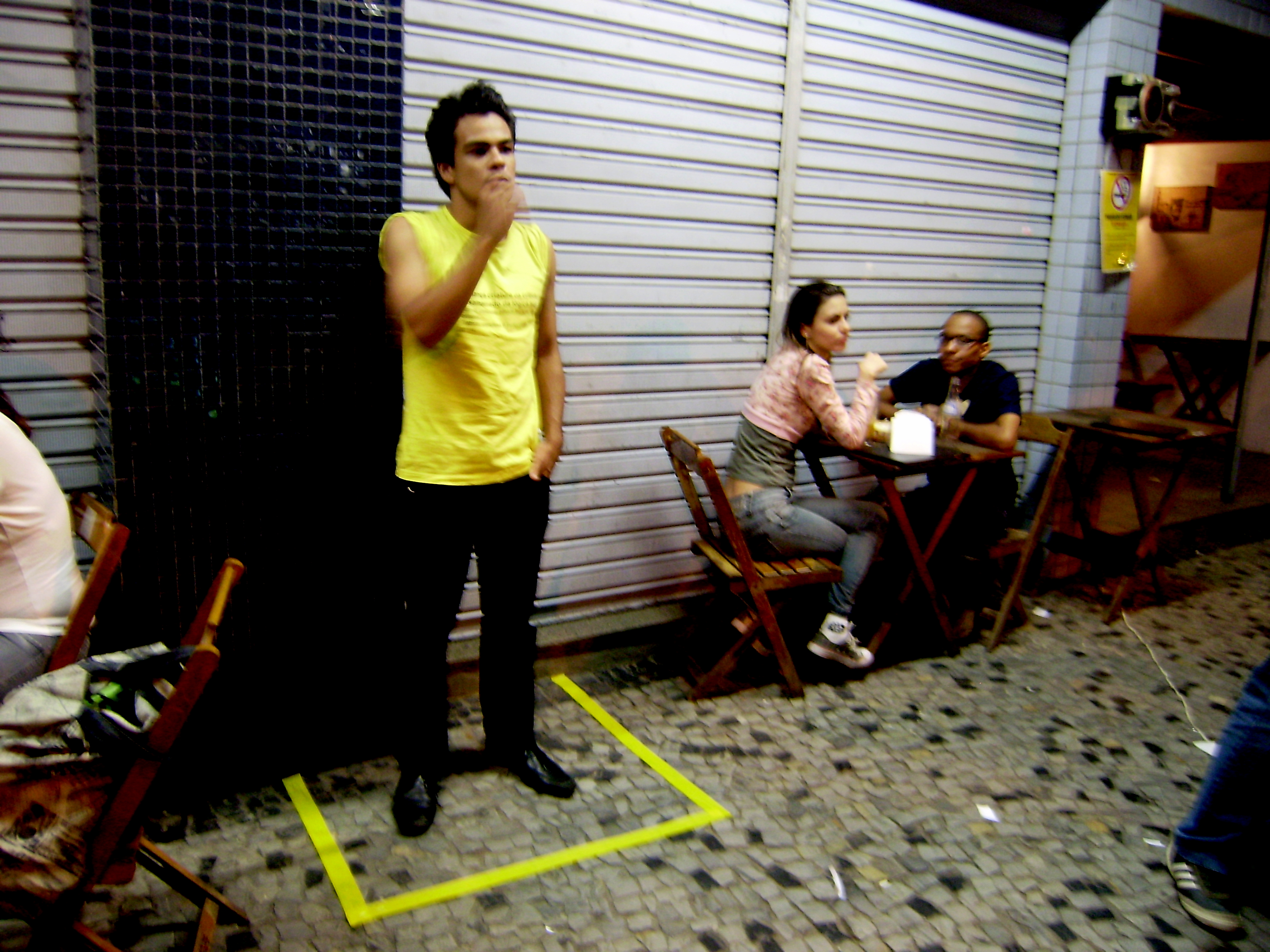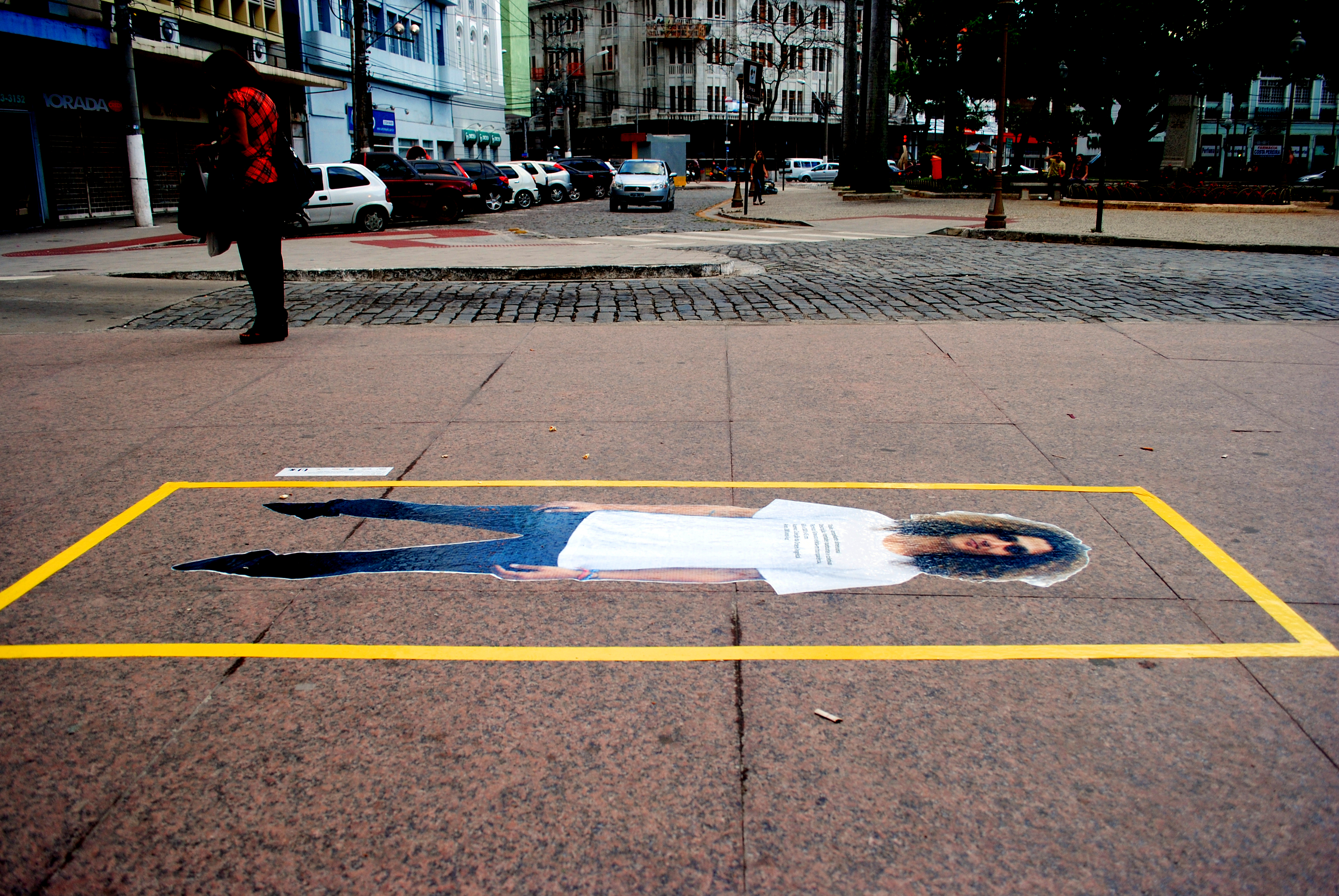 Em torno das peças-performers, encontravam-se faixas delimitadoras de acesso, como na maioria dos espaços expositivos (embora quando transportadas para o espaço público, não sejam mais delimitadoras e sim um sublinhar da coisa exposta). Esse avesso do “cubo branco” localizava-se próximo aos espaços expositivos do Centro da cidade Vitória. As galerias de arte, mesmo de portas abertas, encontram-se na maioria das vezes “fechadas” para o público em geral. O projeto “Seu Título” dialoga com essa dificuldade das galerias criando um distúrbio nos espaços públicos/expositivos.