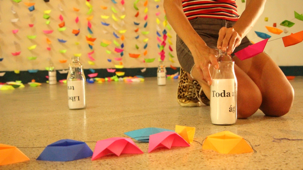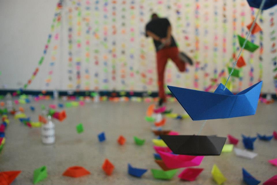 As pinturas escondidas sob camadas brancas de tempo, parecem reforçadas na companhia dos barquinhos coloridos. Pensar nossa relação com o espaço que habitamos e com aqueles que já não habitam mas que deixaram suas marcas, é revelar a dobra irreversível do papel.