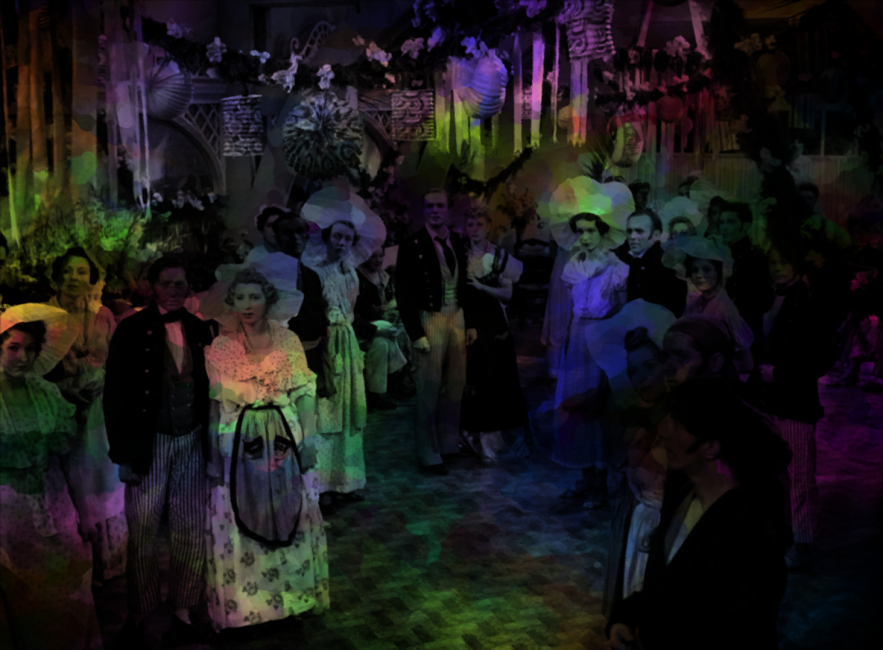 Captura de tela do filme O Conde de Monte Cristo, de 2002. Cena de um baile com muitas pessoas olhando na direção da câmera, editada digitalmente com sobreposição de cama furta-cor.