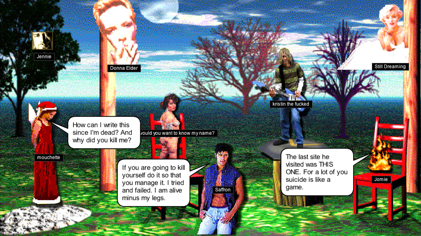 O trabalho começa a se formar com as respostas dadas por espectadores-agentes a pergunta “What’s the best way to kill yourself when you’re under 13?”.[24] O objetivo inicial afirmado por Mouchette seria de uma espécie de “pesquisa de mercado” para fabricar os melhores “brinquedos de suicídio” para seu público. No entanto, as respostas permanecem disponíveis e categorizadas pela artista.[25] O espaço de resposta, inicialmente, delimitaria um círculo para a fala individual, mesmo que pública. Cada interlocutor mantém seu nome vinculado ao texto inserido como proposta de suicídio. A partir desse ponto, cada nome está aberto a tornar-se um avatar e compor a peça programada por Mouchette. Os nomes são anexados a imagens de conhecidos suicidas da cultura pop, de Marilyn Monroe a Kurt Cobain. Essas imagens, assim como o fundo fixo da animação, mantém a aparência improvisada pela qual “Mouchette.org” passou a ser reconhecido (figura 3). A imagem inicial da animação evidencia imediatamente que a peça não apresenta um clássico solilóquio. Duas cadeiras vermelhas ladeiam um tronco de árvore cortado próximo da raiz. Logo, surge à esquerda da tela uma figura cabisbaixa vestida com trajes natalinos, sobre a qual há uma faixa preta contendo a inscrição “Mouchette”. Essa identificação do avatar acompanhará cada uma das figuras que se sucedem sobre o fundo de árvores pixeladas. Algumas desaparecem mais rapidamente, assim que “pronunciam” sua fala, outras permanecem para se “pronunciarem” junto com as demais.