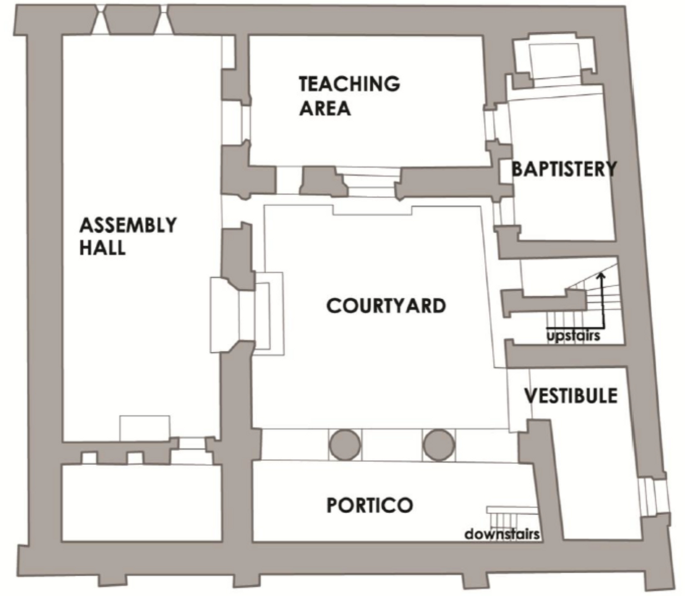 A sala imediatamente ligada ao novo batistério serviria como local de ensino dos novos convertidos e também para audiência dos não iniciados. Ocorre que na igreja cristã primitiva os recém-convertidos eram limitados em alguns passos da cerimônia, de modo que sua entrada no espaço de culto deveria ser apenas parcial. Diante dessa espécie de restrição tornou-se necessário adaptar o peristilo das residências a serem utilizadas como locais de culto, para que pudessem receber os fiéis recém-convertidos, isto é, os catecúmenos. As adaptações visavam manter a separação espacial sem impedir que a cerimônia fosse ouvida pelo grupo (GÜNEY, 2012, p. 112).