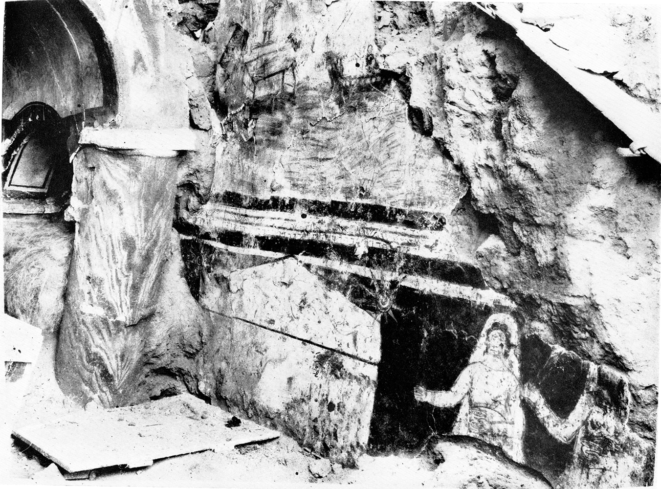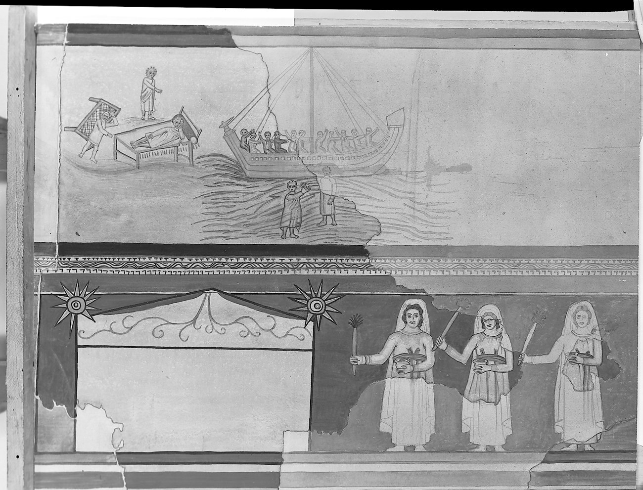 Figura 05. Afrescos da parede norte do batistério. Na parte baixa surgem os restos da figura de Maria na procissão para o sepulcro de Cristo. Na parte superior há a representação de dois milagres (caminhar sobre as águas e a cura do paralítico). Fonte: < http://media.artgallery.yale.edu/duraeuropos/dura.html>