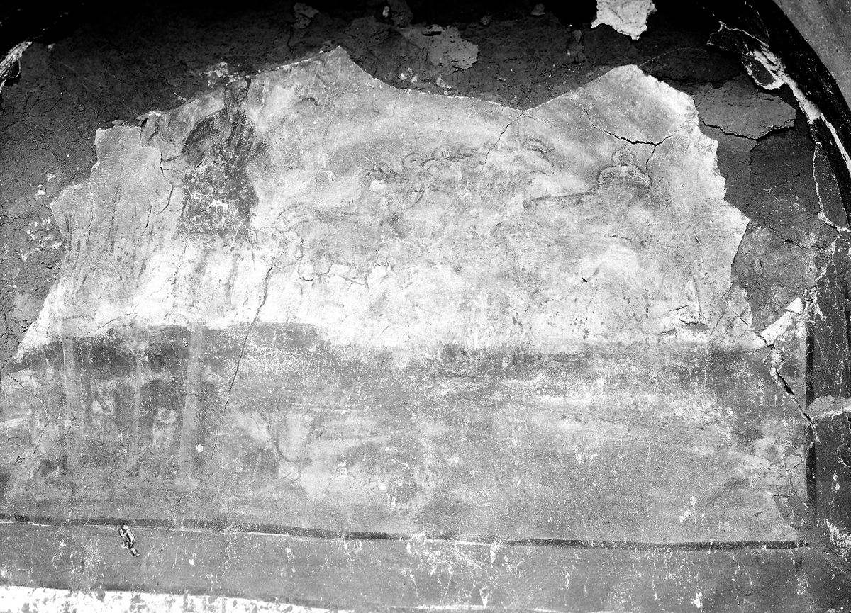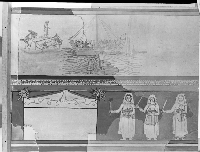 Na parede norte do batistério, duas pinturas surgem em razoável estado de conservação. Ao alto, observa-se a representação de dois milagres de Jesus. O afresco a esquerda mostra a cura do paralítico e imediatamente a direta, Jesus e Pedro caminham sobre as águas.[40] Na parte baixa da mesma parede uma procissão composta por Maria e provavelmente mais três mulheres dirige-se ao sepulcro de Cristo com tochas acesas (Figuras 5 e 6). De um lado, o milagre de Cristo, que sobrepuja a natureza, de outro sua morte como humano, a qual aponta para uma passagem que a assembleia reunida somente poderia atingir com o batismo. Essa é mais uma espécie de representação bastante adequada ao espaço de batismo. O rito do batismo encontra-se envolto na possibilidade de vencer a natureza pecaminosa do humano. Mesmo o Cristo, abandona o corpo humano ao sofrimento (e é lembrado na procissão de Maria). Assim como Cristo, os catecúmenos deveriam deixar o carnal para a morte e ascender à condição de justificado pelo sacrifício.