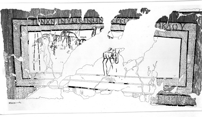 Figura 07. Desenho para recomposição do afresco com representação de Davi matando o gigante Golias. O afresco, do qual restaram poucos fragmentos, pode, ainda assim, ser corretamente relacionado à passagem indicada em razão das inscrições dos nomes de Davi e Golias, ainda legíveis. Fonte: <http://media.artgallery.yale.edu/duraeuropos/dura.html>