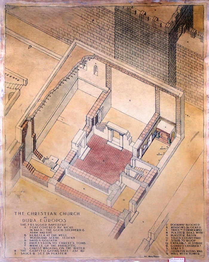 No caso da domus ecclesiae de Dura Europos, deve-se considerar tanto o contexto de perseguição romana quanto os fatos de ser uma construção imersa num ambiente mitraísta[33] e adaptada por judeus cristãos. Nascente em meio à perseguição[34] e a oposição mitraísta, a ligação com a lei judaica deveria surgir como um peso menor e mesmo favorável à manutenção de uma nova crença.