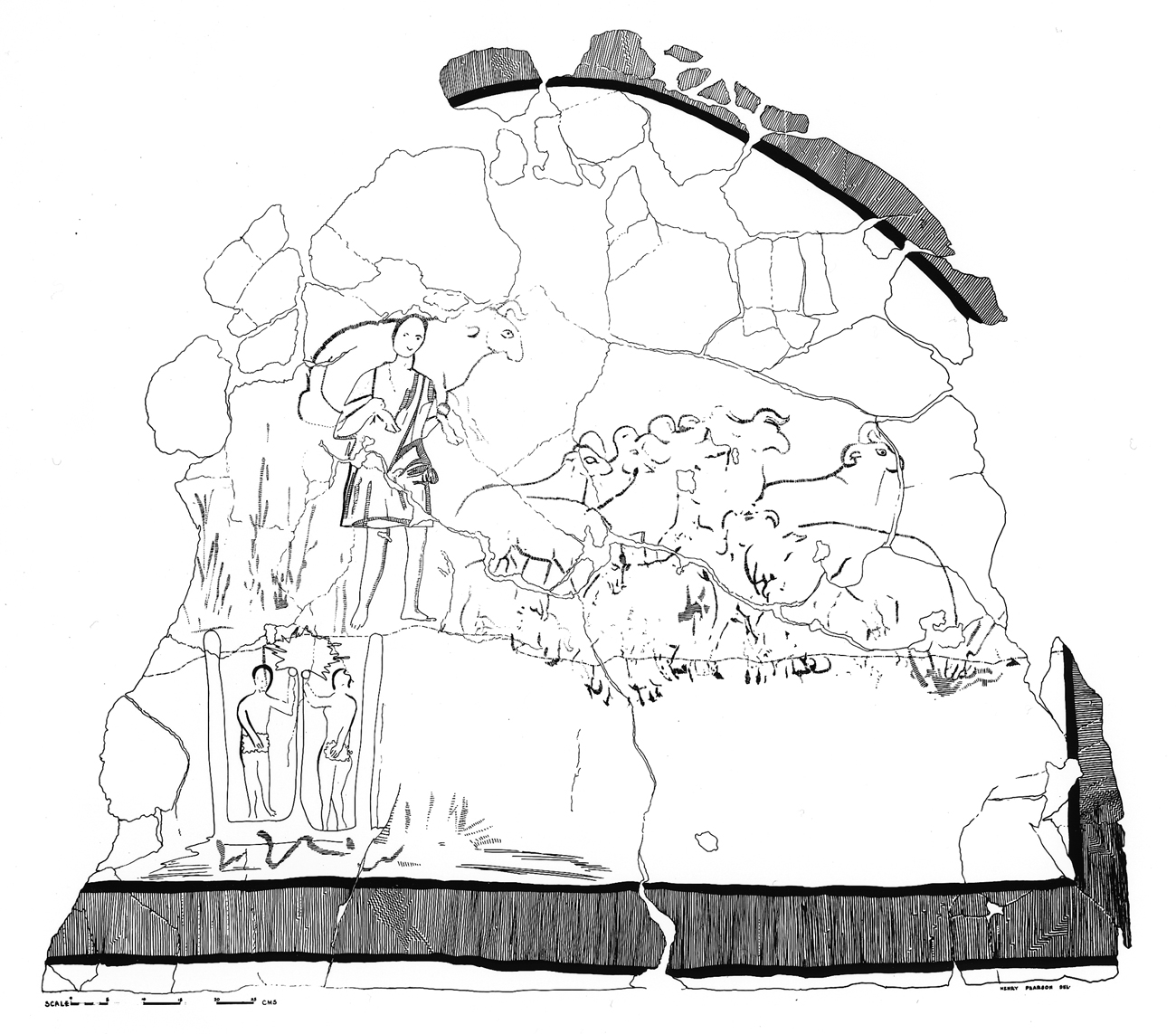 Figura 04. Desenho para recomposição de afrescos do batistério referentes à figura 03. É possível observar mais adequadamente a figura do jovem pastor com o cordeiro sobre os ombros a guiar o rebanho à direita. Adão e Eva surgem em detalhe logo abaixo à esquerda. Fonte: <http://media.artgallery.yale.edu/duraeuropos/dura.html>