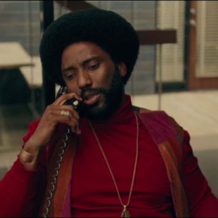 Cena do filme “Infiltrado na Klan” (2018), de Spike Lee, na qual o ator John David Washington, caracterizado como um personagem dos anos 1970, fala ao telefone.
