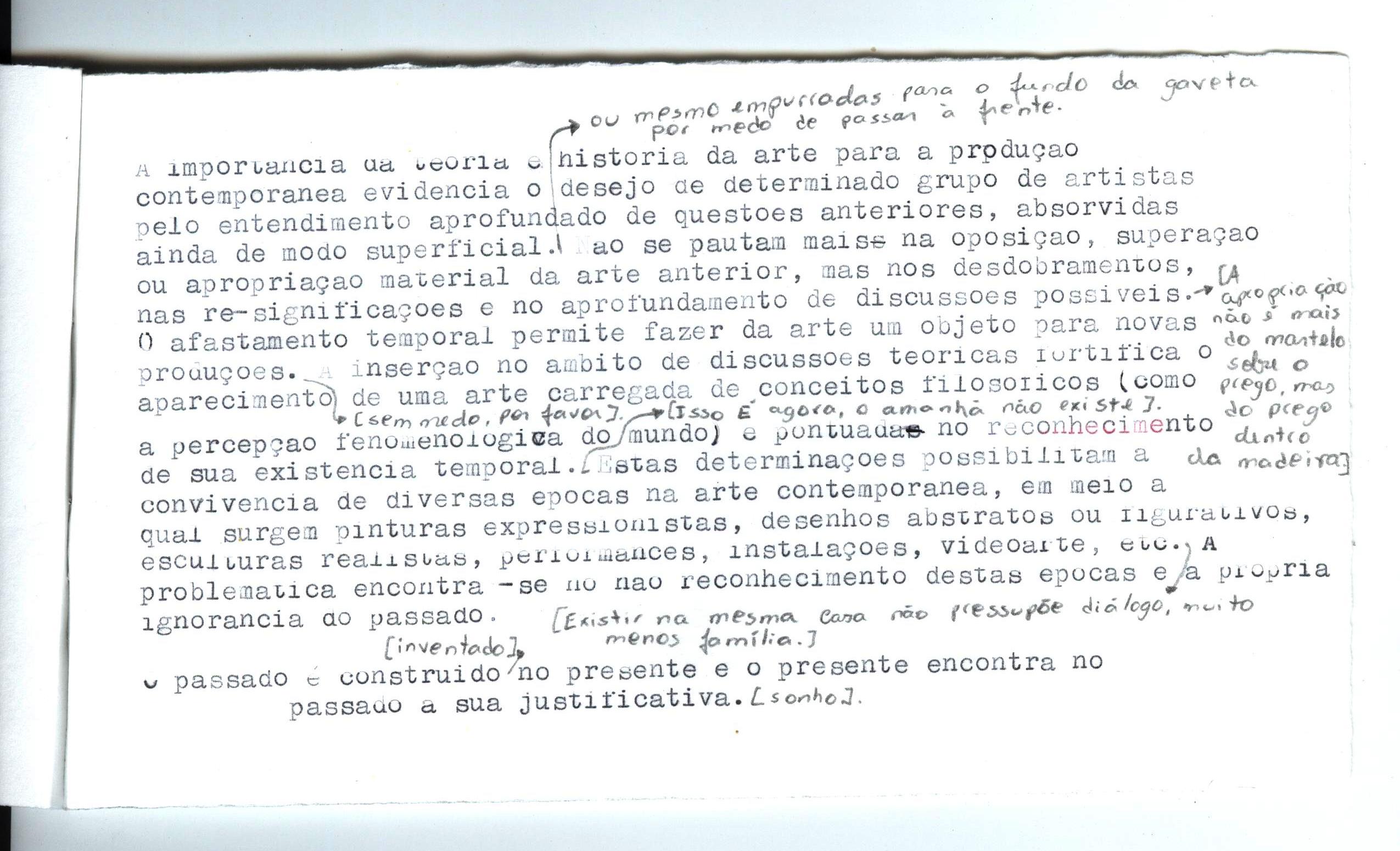 A importância da teoria e história da arte para a produção contemporânea evidencia o desejo de determinado grupo de artistas pelo entendimento aprofundado de questões anteriores, absorvidas ainda de modo superficial [ou mesmo empurradas para o fundo da gaveta por medo de passar à frente]. Não se pautam mais na oposição, superação ou apropriação material da arte anterior, mas nos desdobramentos, nas re-significações e no aprofundamento de discussões possíveis. [A aproximação não é mais do martelo sobre o prego, mas do prego dentro da madeira]. O afastamento temporal permite fazer da arte um objeto para novas produções [sem medo, por favor]. A inserção no âmbito de discussões teóricas fortifica o aparecimento de uma arte carregada de conceitos filosóficos (como a percepção fenomenológica do mundo) e pontuada no reconhecimento de sua existência temporal. [Isso É agora, o amanhã não existe]. Estas determinações possibilitam a convivência de diversas épocas na arte contemporânea, em meio a qual surgem pinturas expressionistas, desenhos abstratos ou figurativos, esculturas realistas, performances, instalações, videoarte etc. [Existir na mesma casa não pressupõe diálogo, muito menos família]. A problemática encontra-se no não reconhecimento destas épocas e a própria ignorância do passado.