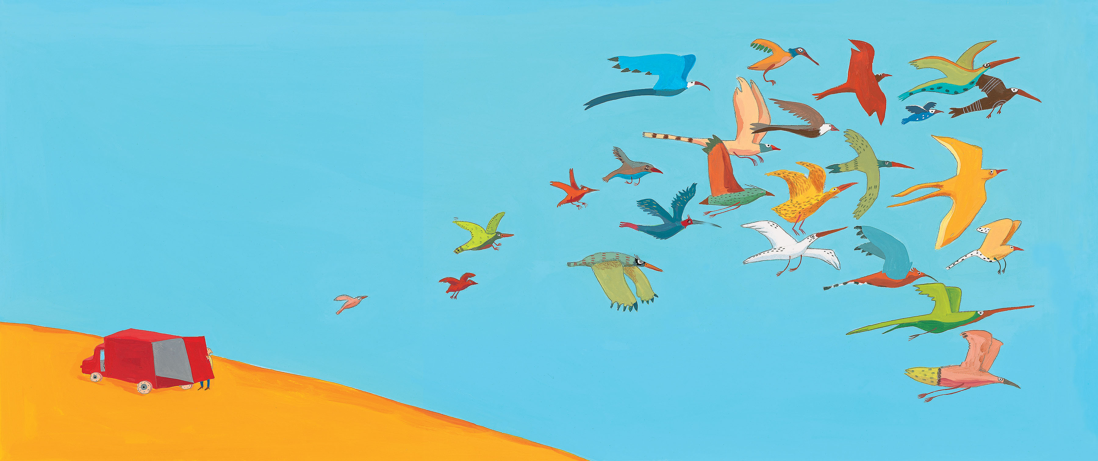 Imagem de capa. Página do livro “Os Pássaros”, de Germano Zullo, com ilustrações de Albertine (Editora 34, 2013). Ilustração, fundo azul claro como céu, caminhão sobre um morro de terra amarelo escuro no canto esquerdo inferior, diversos tipos de pássaros, de tamanhos e cores diferentes, voam da esquerda para a direita, em primeiro plano.