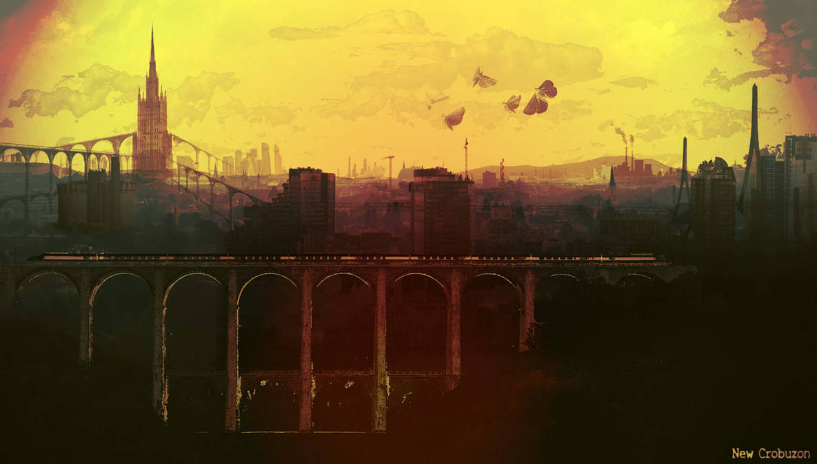 Imagem de capa. New Crobuzon. HiHaFizi. Ilustração. Fonte: https://www.deviantart.com/hihafizi/art/New-Crobuzon-711432466 Descrição: em tons de amarelo, marrom e ocre, cidade coberta de fumaça, vista de longe, com arcos de um viaduto, sobre o qual passa um trem, em primeiro plano e torre pontiaguda ao fundo, à esquerda. Ao centro, no céu amarelado, voam formas parecidas com borboletas com asas pretas.