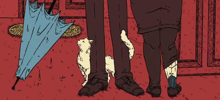Imagem de capa. Recorte da capa da noveleta Cabaré em chamas, de H. Pueyo. Ilustração de Dante Luiz. Um gato branco se enrosca nas pernas de alguém que veste calças marrons e segura um guarda-chuva azul. À direta dessas pernas, há as pernas de outra pessoa, de frente para a primeira. A segunda pessoa tem pernas roliças e uma delas é mecânica. Toda a ilustração é linear e colorida com tons próximos do marrom e do avermelhado, com exceção do gato, do guarda-chuva e de um pequeno tapete amarelado, o fundo e à esquerda.