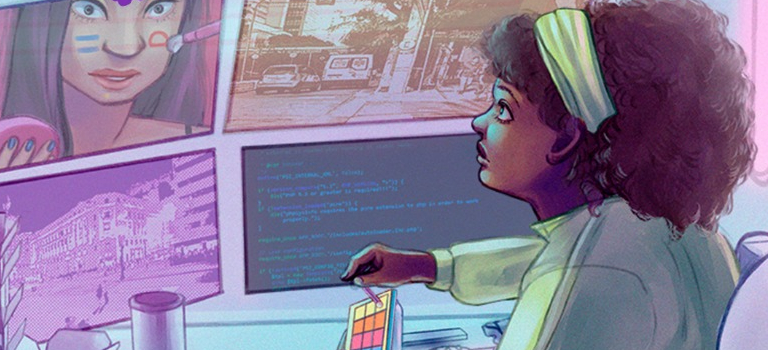 Imagem de capa. Recorte da capa da noveleta Suor e silício na terra da garoa, de Vanessa Guedes. Ilustração de Debbie Garcia. Jovem negra diante de várias telas de computador com imagens da cidade de São Paulo. Em duas das telas aparece o rosto de uma mulher que se maquia. Os monitores estão sobre uma bancada com objetos de escritório e teclado de computador. A jovem segura um estojo de maquiagem e veste um agasalho verde claro. A ilustração tem traços fortes e tons aquarelados.