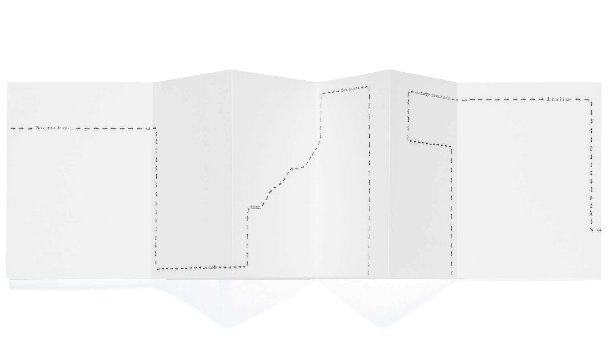 Abri o livro sanfonado, procurei a formiga entre as suas companheiras e nada. Acompanhei cada fileira, cada selinho entre as formigas, nada. Observei com atenção as letras da poesia. De tão pequena, poderia ter se feito de acento. Nada.
