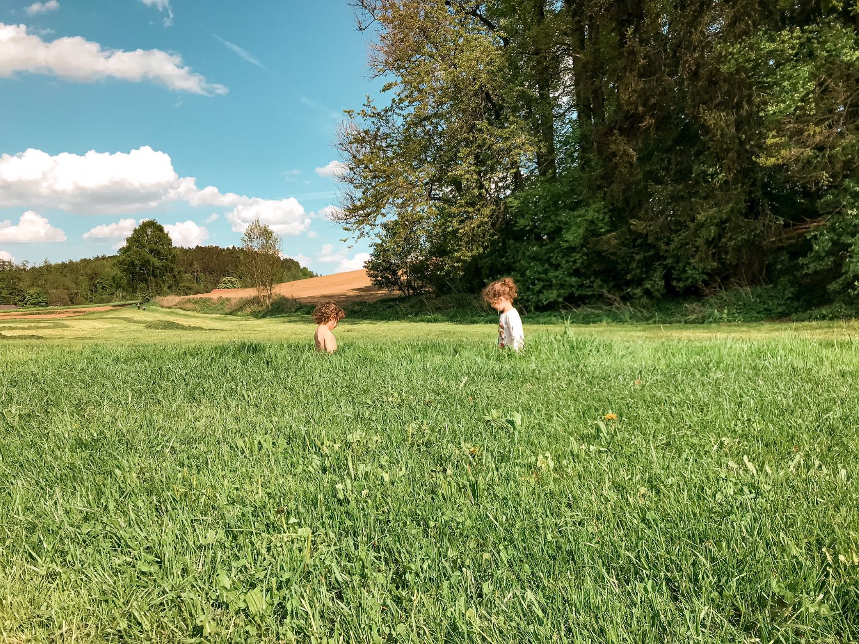 Melhor parquinho do mundo. Fotografia de Camilla Saloto, 2022. Duas crianças em paisagem campestre com mato alto, cobrindo parte do corpo das crianças, árvores à direita e campo de plantação à esquerda ao fundo.
