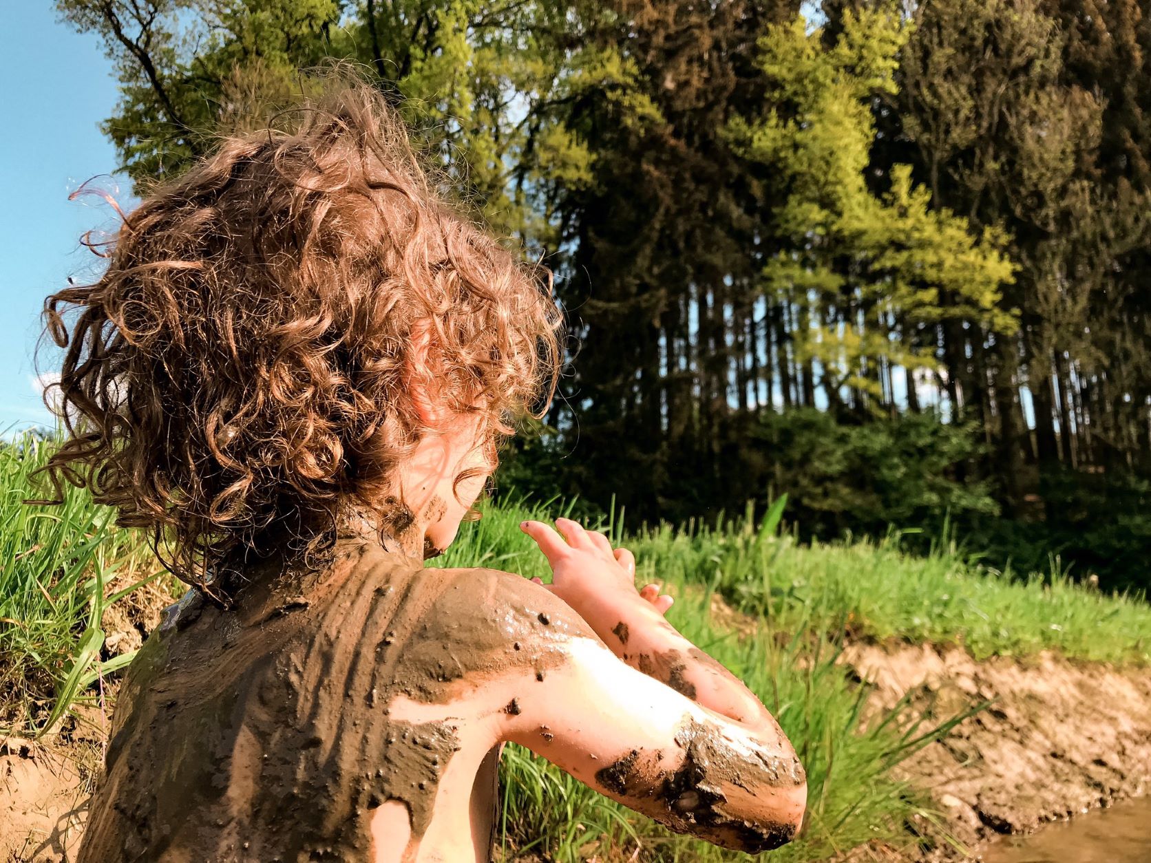 Melhor parquinho do mundo. Fotografia de Camilla Saloto, 2022. Criança branca de cabelos cacheados, de costas, coberto de lama. Ao fundo, árvores, grama e pequeno riacho.