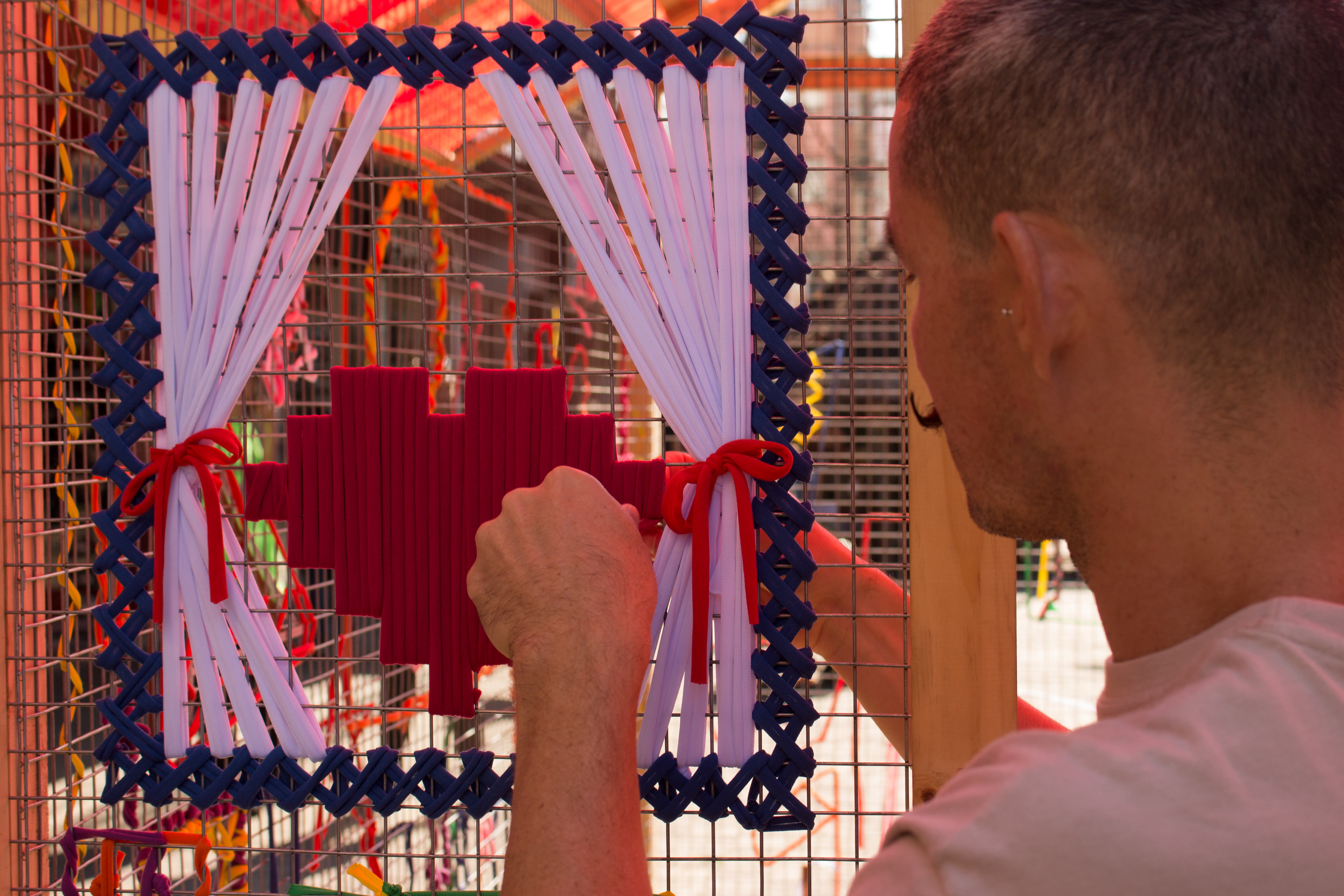 Rick Rodrigues, Con(fiar) Memórias, 2024. Instalação interativa. Nova Friburgo-RJ (Praça Demerval Barbosa Moreira) e Teresópolis-RJ (Calçada da Fama). Fotografia Pam Campos. Cortesia do artista. Descrição: o artista de costas, em plano fechado, bordando um grande coração com linhas grossas de malha em uma tela de arame.