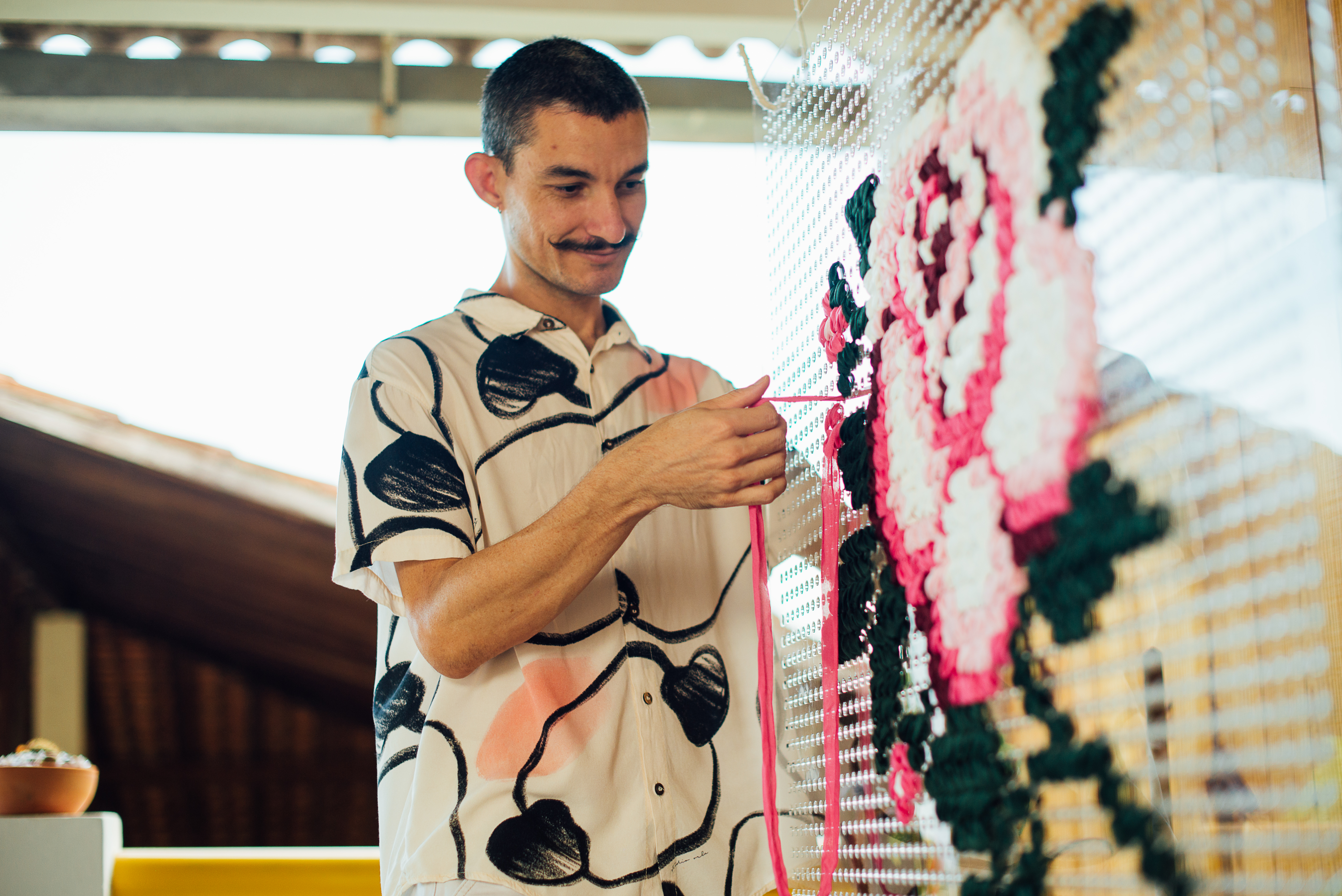 Rick Rodrigues, Permitir o afeto, 2022, Intervenção urbana. Bordados com fios de malhas sobre placas de acrílico. Dimensões 120 cm x 120 cm cada. João Neiva-ES. Fotografias Junior. Descrição: homem branco e magro de cabelos curtos escuros e bigode, vestindo uma camisa clara, segurando uma linha rosa, diante de um grande bordado feito em uma placa de acrílico suspensa. Vemos a cena ligeiramente de baixo, em plano médio. O homem está em segundo plano, pois em primeiro surge a flor rosa do grande bordado, à direita da imagem.