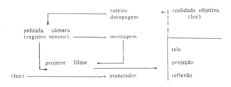 Figura 1. Esquema. Fonte: Baudry, 2003, p. 385). Quadro branco com as indicações, de cima para baixo: roteiro decupagem, com seta para a esquerda e para baixo, que indica: película câmera (registro sonoro), com seta para a direita, que indica: montagem, e seta para baixo e para a direita, que indica: projetor filme, que também recebe uma seta de “montagem” e direciona outra seta para a direita, para três palavras separadas por uma barra vertical e outra horizontal: tela, projeção, reflexão. Sobre essas três palavras, separado por uma faixa pontilhada à esquerda, com uma pequena seta para a esquerda, lê-se: realidade objetiva (luz). Na base esquerda do quadro lê-se: (luz), com uma seta longa para a direita, que termina em “espectador”.