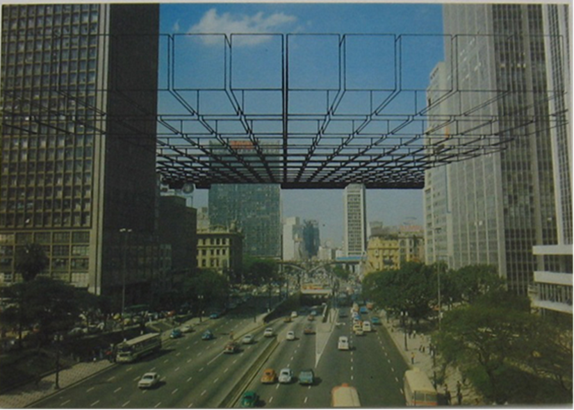 Figura 2. Regina Silveira, “Interferências”, serigrafia sobre cartão-postal, 1976. Fotografia de uma avenida movimentada, vista de cima, com inserção de quadrados pretos e lineares na parte superior da imagem, como se formassem um teto sobre a avenida.