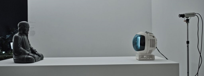 Figura 3. Nam June Paik, “TV-Buddha”, 1974. Instalação com escultura de Buda à esquerda, sobre um tablado branco, voltado para um aparelho de TV branco de tubo catódico do outro lado dessa longa bancada. O cenário é uma galeria de paredes brancas.