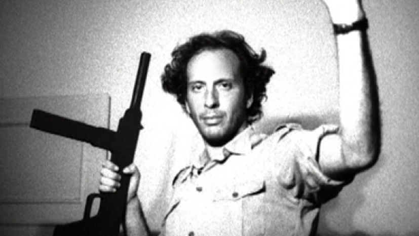 Figura 4. Arthur Omar, “Vocês”, 1979. 35mm. Homem branco de cabelos escuros desgrenhados com camisa de botões e bolsos nos peitos, mangas dobradas até metade dos antebraços e colarinho apertado, olhando para a câmera, com a mão esquerda erguida fora da tela e a direita segurando uma metralhadora apontada para cima.