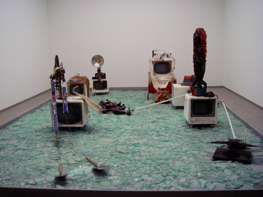 Para a grande maioria dos vídeo-artistas, a instalação é o lugar dessa resistência [resistência ao fluxo televisivo]. A instalação induz um espaço ao mesmo tempo físico e virtual no qual o espectador reapropria a seu bel-prazer os conceitos que colocam a instituição em xeque, abrindo caminho para uma interação tanto crítica como imaginária. Mas isso também vale para as galerias e os museus, para a projeção de vídeos, arrancados do fluxo e freqüentemente apresentados em condições inteiramente diversas […]. (Bellour, 1997, p. 69)