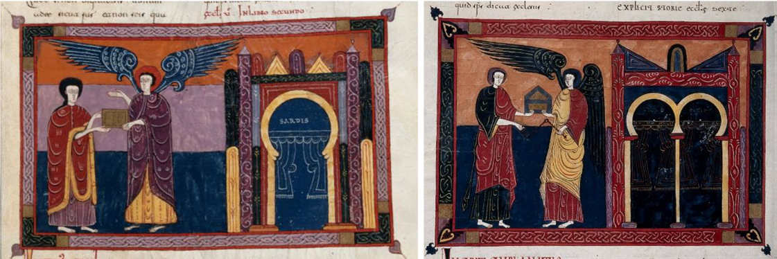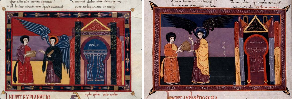 Figura 2. Beatus de Facundus, 1047, f. 78 e f. 82v (detalhe). Esta e as duas próximas imagens mostram João ao lado de um anjo, com um templo ao lado direito da imagem. Em cada iluminura, João porta um livro diverso, com formato variado, como já explicado no texto.
