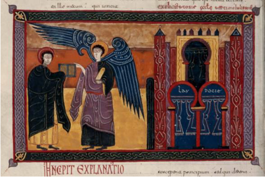 Figura 5. Beatus de Facundus, 1047, f. 106v (detalhe). João segurando um livro retangular, ao lado de um anjo, com templo à direita.