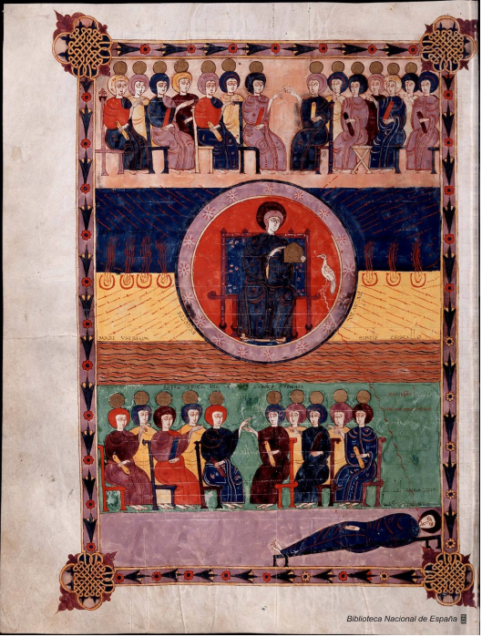Figura 6. Beatus de Facundus, 1047, f. 112v. Cristo entronizado ao centro, dentro de um óculo, com faixas ao fundo desse óculo. Nas faixas superior e inferior, pessoas sentadas em cadeiras. Na parte baixa do fólio, pessoa deitada como morta.