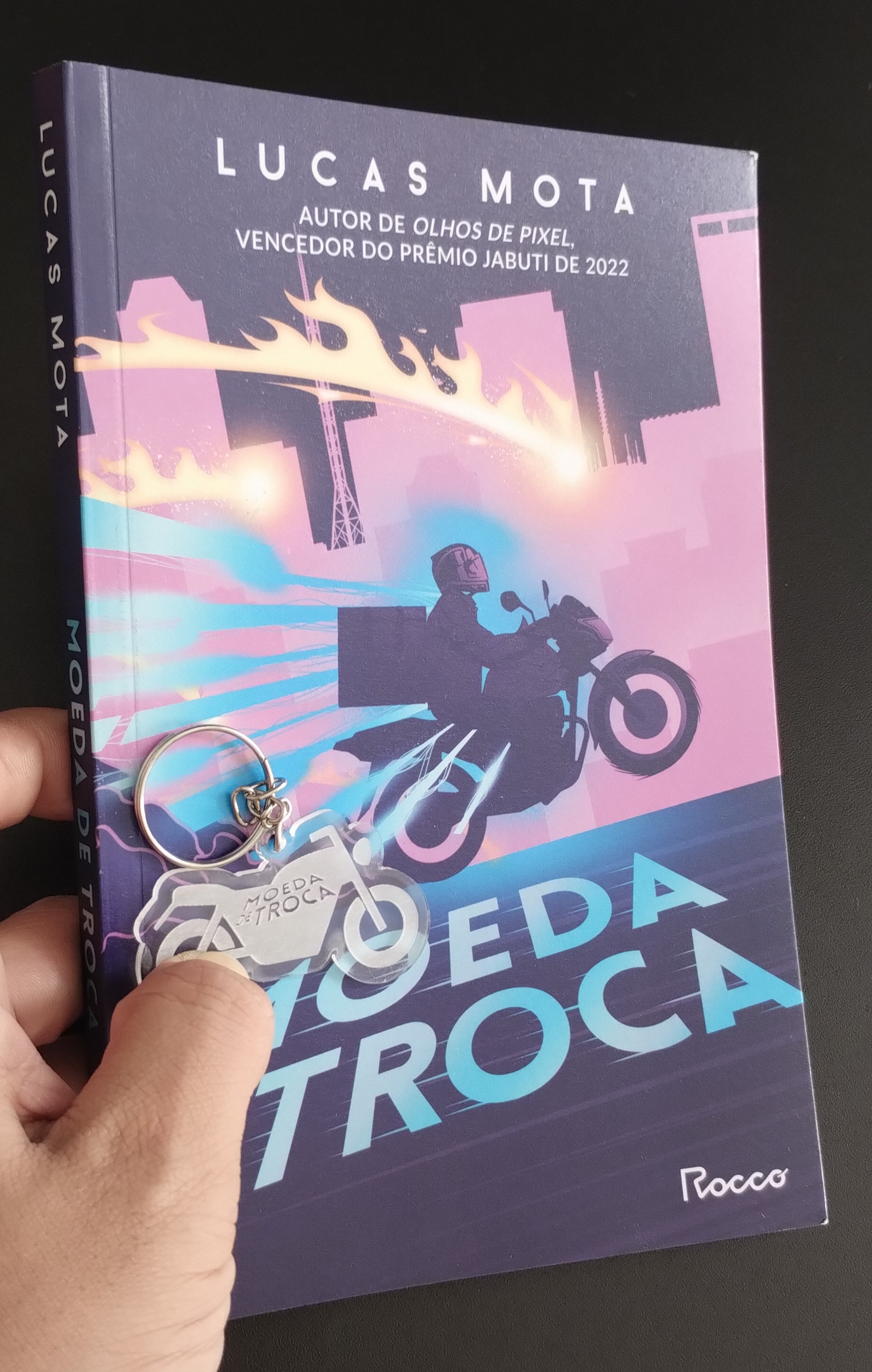 Mão segurando exemplar físico do livro “Moeda de Troca”, de Lucas Mota. A capa mostra a ilustração da silhueta de uma moto com piloto usando uma mochila com caixa de entregador. Linhas azuis saem da moto, dando a impressão de velocidade. Ao fundo, duas faixas de fogo cortam o cenário de formas que indicam prédios em tom de rosa no horizonte. Sobre o asfalto, logo abaixo da moto, o título do livro.