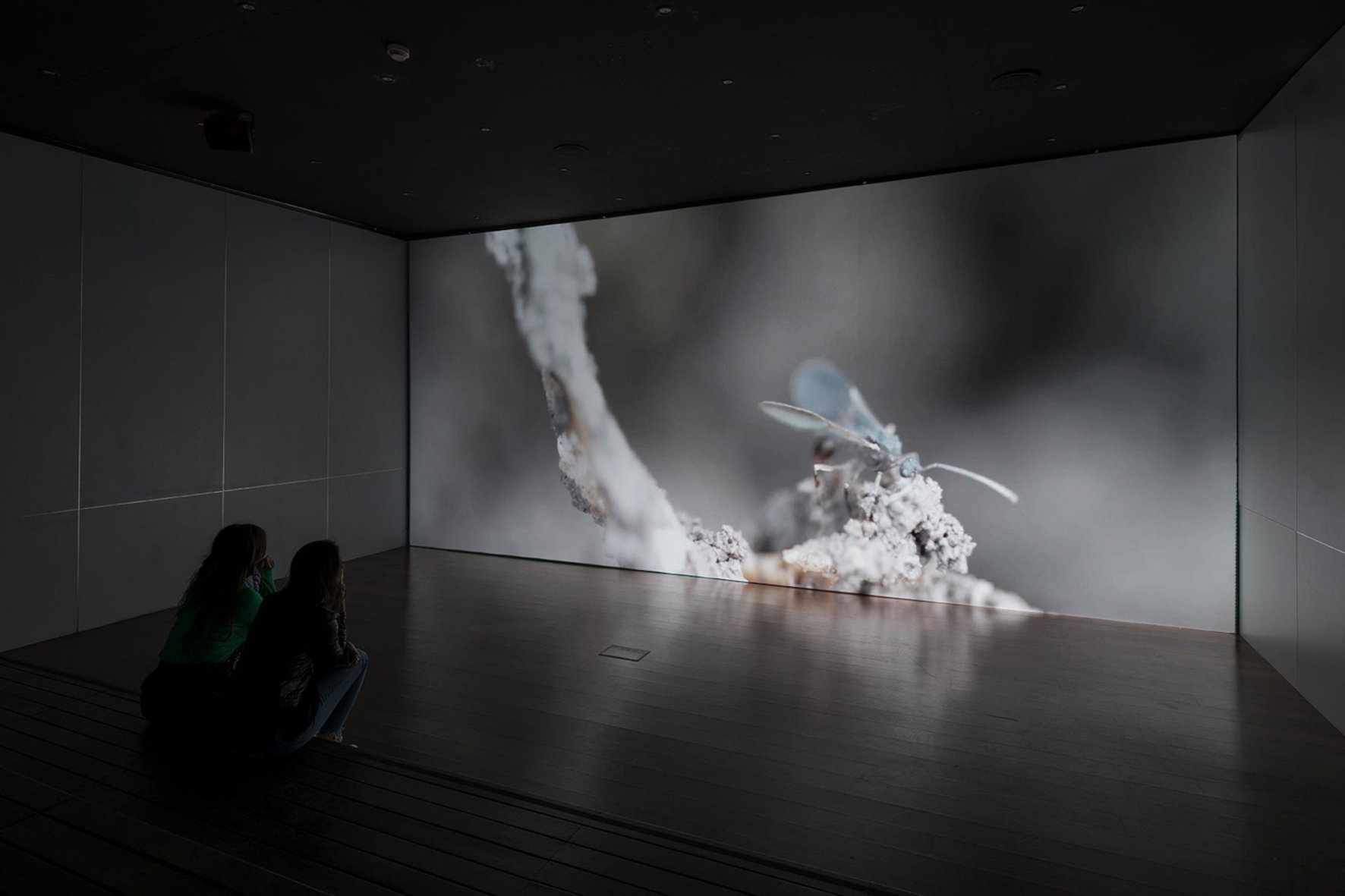 Figura 1. Liminal, La casa encendida, Maya Watanabe, 2019. Videoinstalação, Madri. Foto de Roberto Ruiz. Fonte: https://mayawatanabe.com/LIMINAL-2. Acesso em: 02 dez. 2024. Sala escura, com projeções que cobrem duas paredes e silhueta de suas pessoas à esquerda, sentadas de frente para a tala maior, à ao fundo da imagem, que mostra com muitos detalhes uma mosca pousada sobre restos de um cadáver descoberto. Pela aproximação da imagem, não é possível identificar nenhuma parte de corpo ou adivinhar exatamente sobre o que a mosca está pousada.