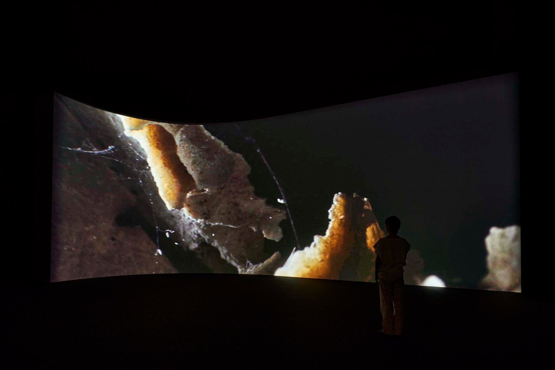 Figura 2. Bullet, Maya Watanabe, 2021, Videoinstalação. MOT, Museu de Arte Contemporânea de Tóquio Fonte: https://mayawatanabe.com/BULLET. Acesso em: 02 dez. 2024. Sala escura com ampla projeção em parede ao fundo, com silhueta de pessoa à direita, observando a projeção de perto, que mostra em detalhe fragmentos de osso com extrema aproximação.