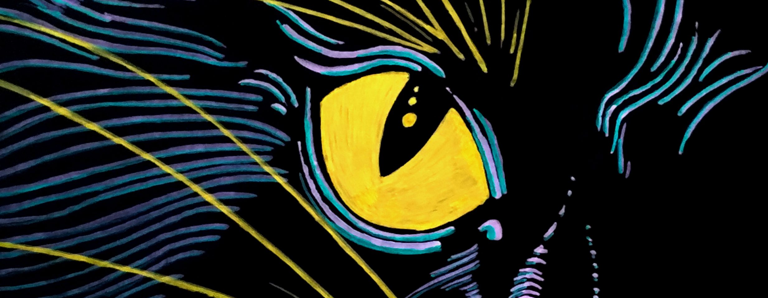 Detalhe de ilustração que mostra o olho amarelo de um gato preto e seus pelos marcados por grossas linhas azuis, violeta e amarelo, tudo em alto-contraste.
